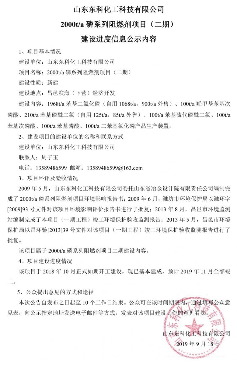 多宝官方网站 2000t/a 磷系列阻燃剂项目(二期) 建设进度信息公示内容